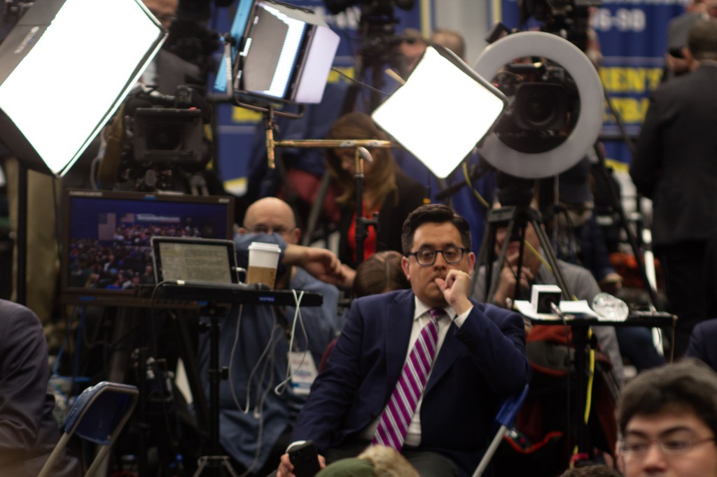 Members of the media patiently wait for Bernie Sanders to take the stage in Manchester, NH on Tuesday, February 11 2020
